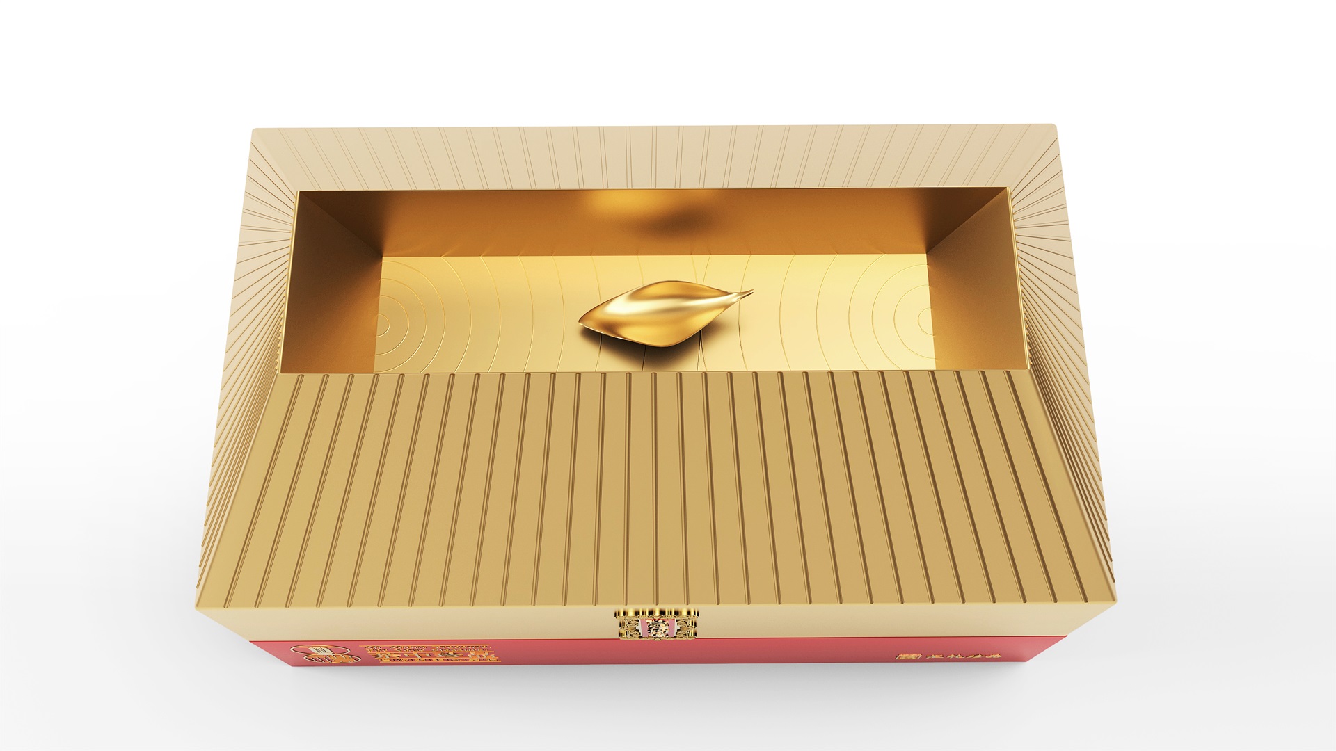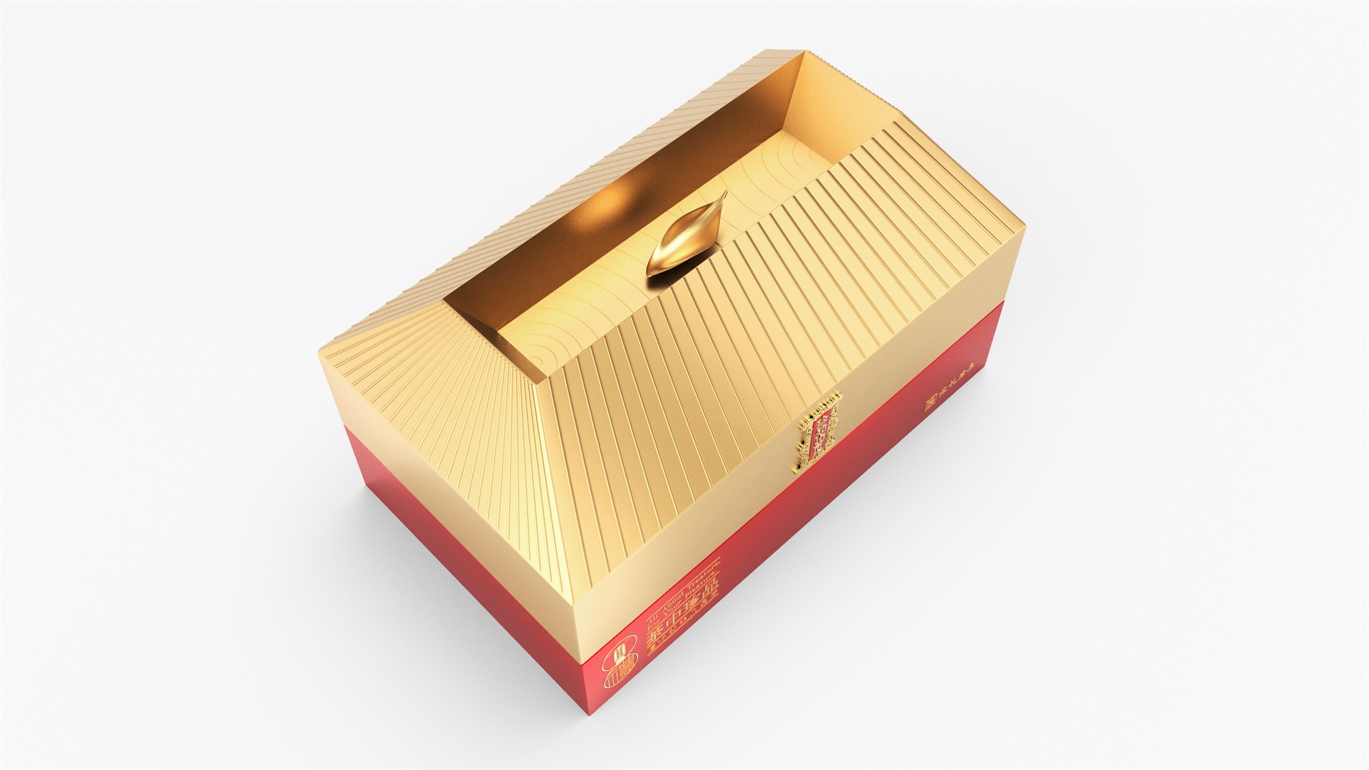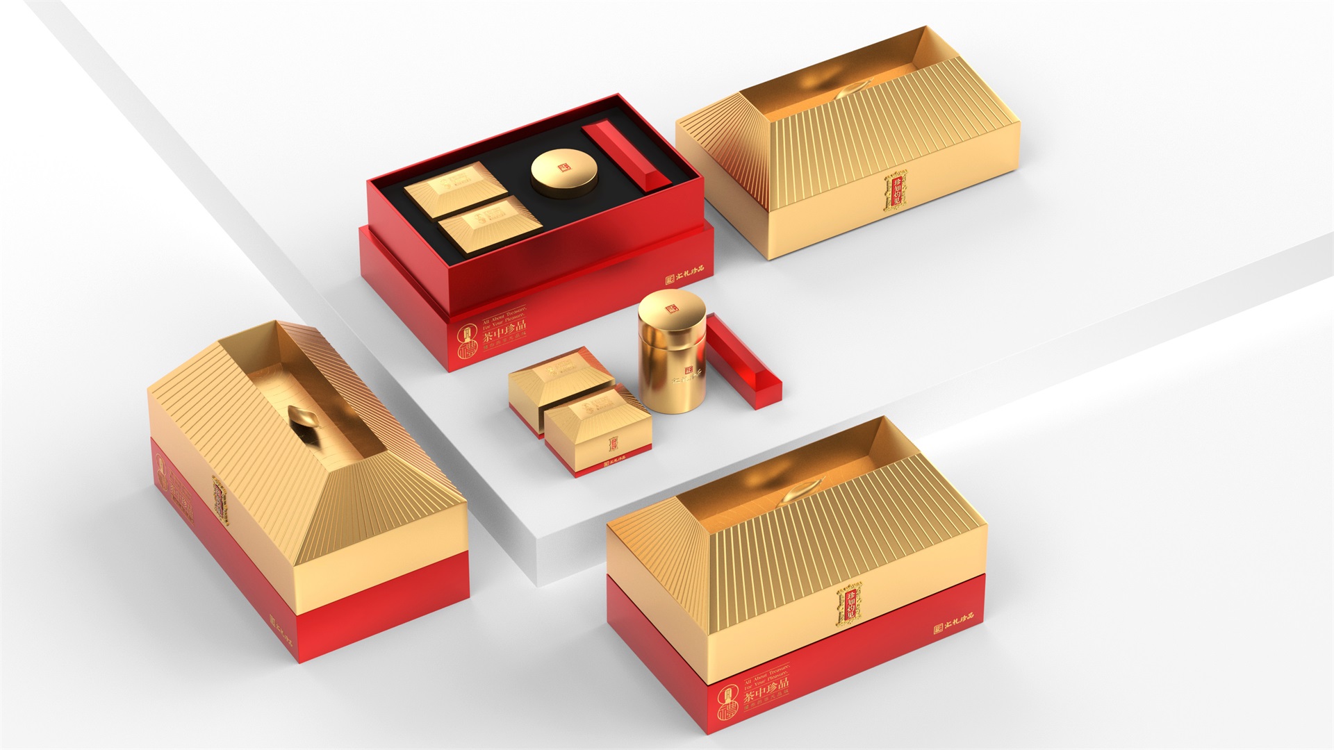 汇礼珍品包装设计,基于产品品级为茶中王者级别,J9九游国际站所以包装整体造型采用中国古代地位的皇家元素:宫殿为设计灵感进行设计,包装上盖为金色宫殿屋檐造型,斜面上也装饰了代表瓦片的条纹,上盖中部内陷,底部使用水纹铺底,在水纹上飘着一片金色的茶叶,高山流水觅知音,在一个上盖营造出了基于高端气质上,茶道与人道相融的意境画面;在上盖的正面中部,使用宫殿匾额形式作为展示包装的品类名称,将包装的宫殿造型进一步完善。支撑金色宫殿下方的红色地台作为包装下部,在正面放置文字信息和品牌标志。整体采用天地盖的形式,使开盖具备仪式感。内部分包装与外部形式大体相同,但有所以简略,保证整体性的同时也保证整体包装不会过于繁复,保持平衡。